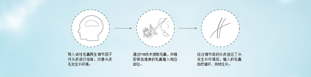 毛大夫植发创CUE种植术,通过培育和调节非正常头皮的生长环境后,植入毛囊逐渐转化成自然生长状态,并持续生长。