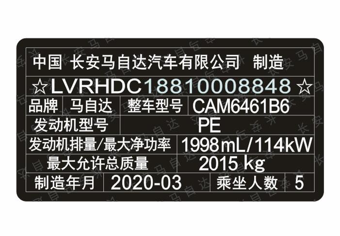 长安马自达汽车出厂铭牌条码标签制作