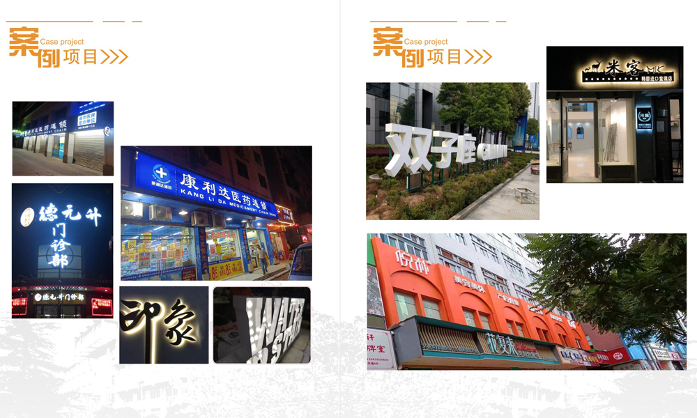 广告系列:制作户内外大型广告、喷绘、LED发光字工程、水晶字、各类精工金属字、LED显示屏、超薄灯箱、奖杯及各类金属标牌等。